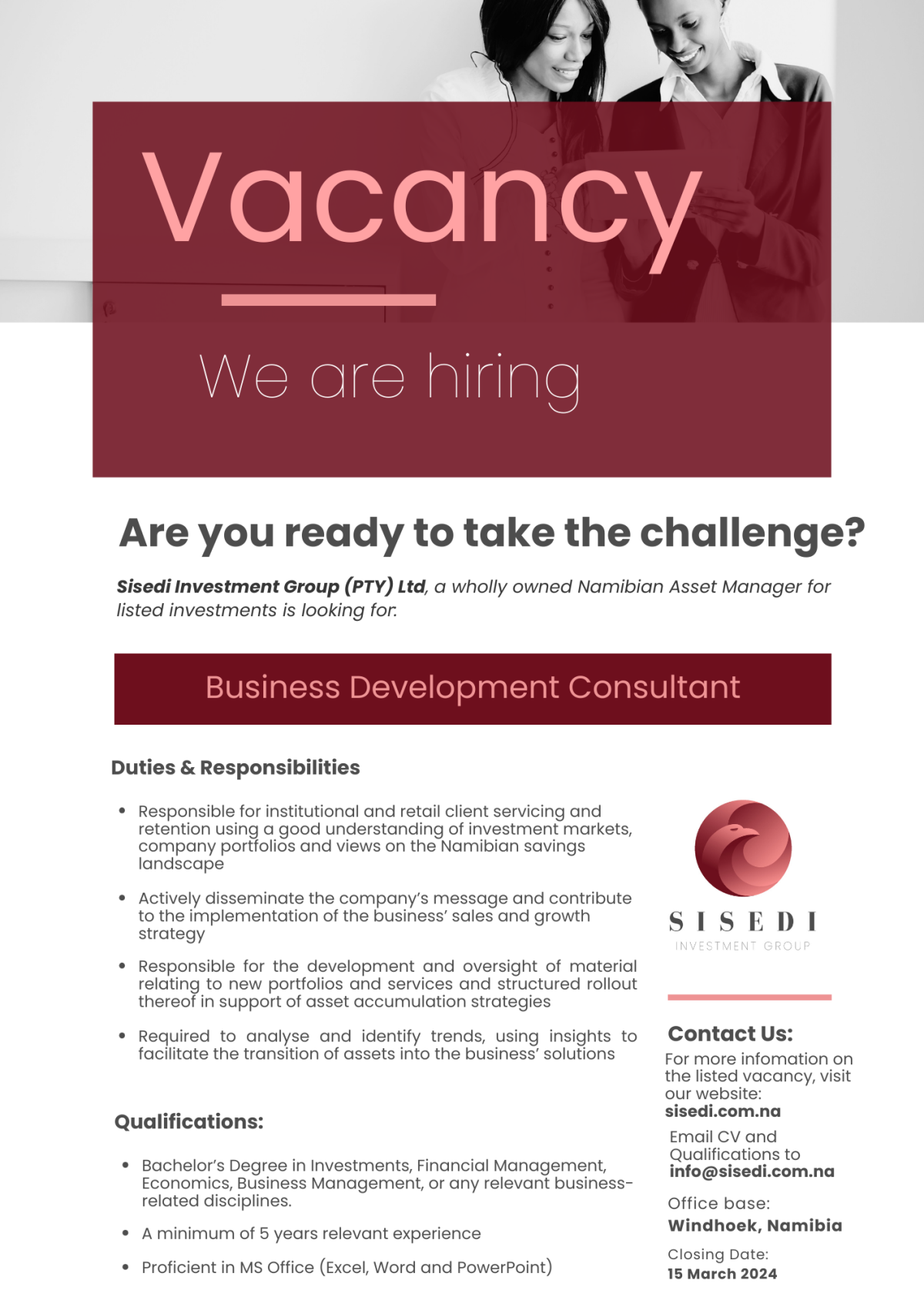 Sisedi Investment Group has an opportunity for a qualified Business Development Consultant to join the team. The incumbent will form part of a dynamic team responsible to provide strategic management and provide sound stakeholder engagement and relationship management to cater to Sisedi’s clients.