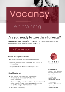 Sisedi’s investment has an opportunity for a qualified investment professional to join the team. The incumbent will form part of a dynamic team responsible to