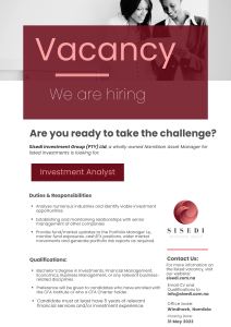 Sisedi’s investment team has an opportunity for a qualified investment professional to join the team. The incumbent will form part of a dynamic team responsible